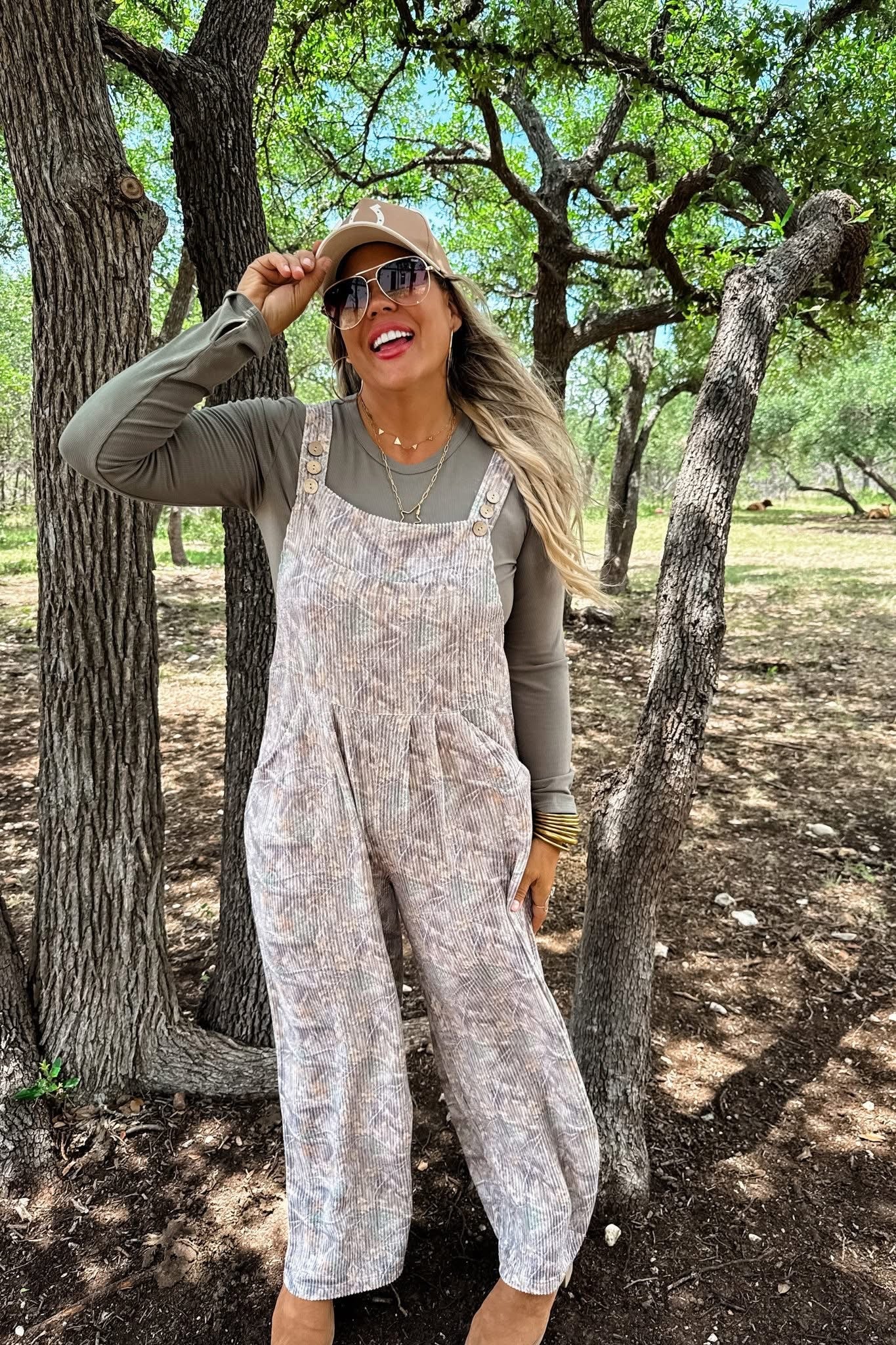 New camo print overalls! Printed on our super popular ribbed fabric. We tweaked a couple things about this popular style similar to our best selling "Karli" style overall. We shortened the length 2", added buttons on the overall strap so there is no strap "hanging" in the front, and added a pleat to the back to make a better "draped" look!
